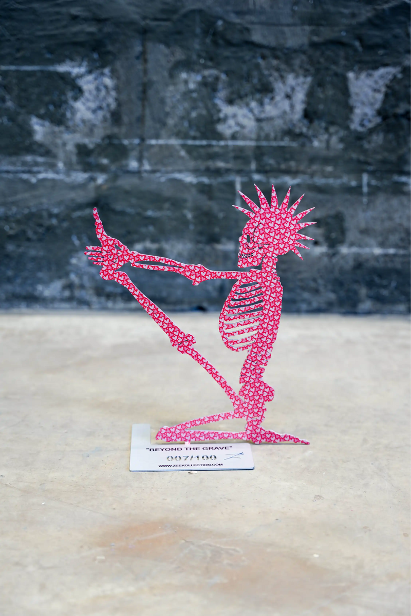 Crafted from premium, thin-sheet steel, each sculpture in this captivating series features a stylized skeleton, brought to life with unique, thought-provoking patterns. These intricate designs, born from the artist's contemplation of the unknown, offer a tangible representation of our curiosity about the afterlife.