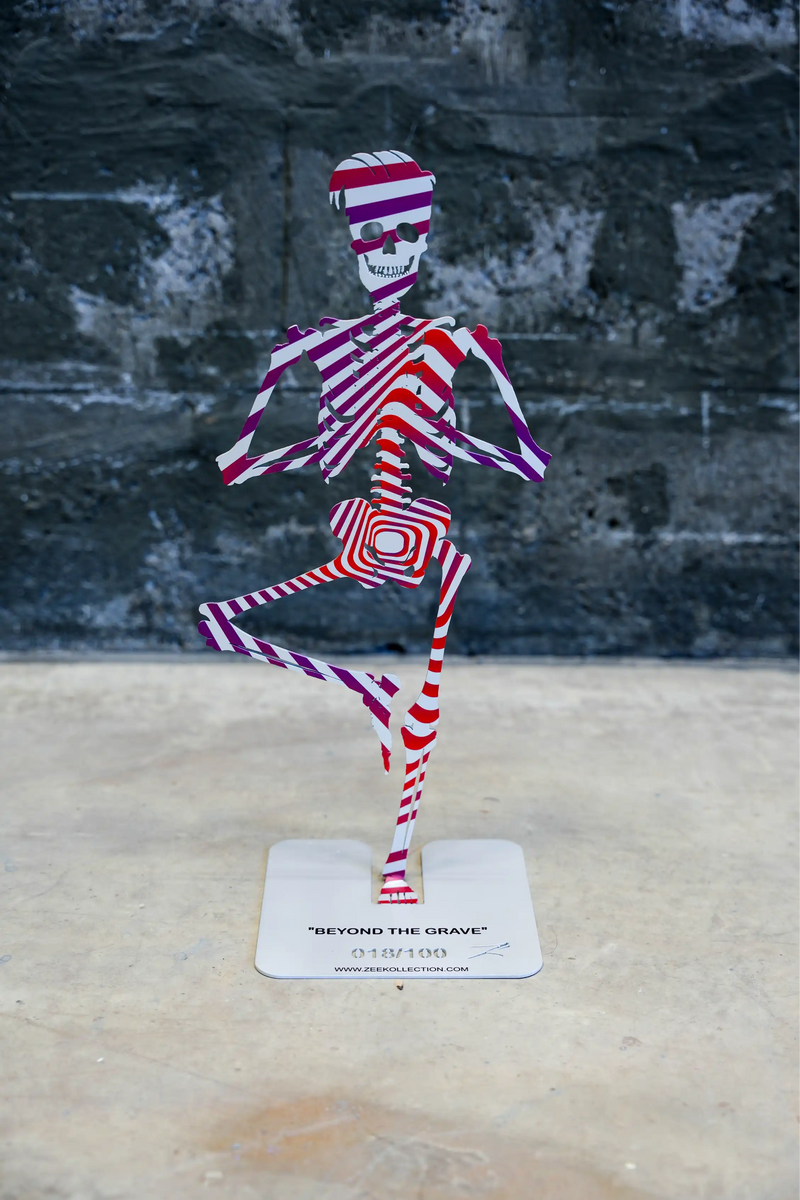Crafted from premium, thin-sheet steel, each sculpture in this captivating series features a stylized skeleton, brought to life with unique, thought-provoking patterns. These intricate designs, born from the artist's contemplation of the unknown, offer a tangible representation of our curiosity about the afterlife.
