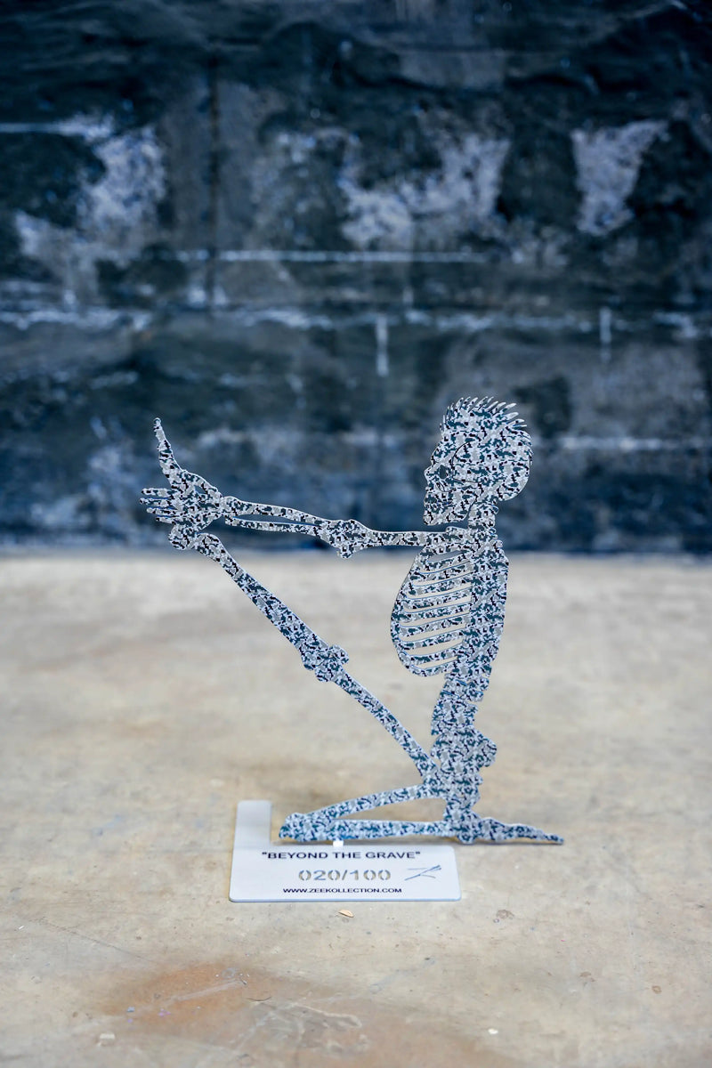 Crafted from premium, thin-sheet steel, each sculpture in this captivating series features a stylized skeleton, brought to life with unique, thought-provoking patterns. These intricate designs, born from the artist's contemplation of the unknown, offer a tangible representation of our curiosity about the afterlife.